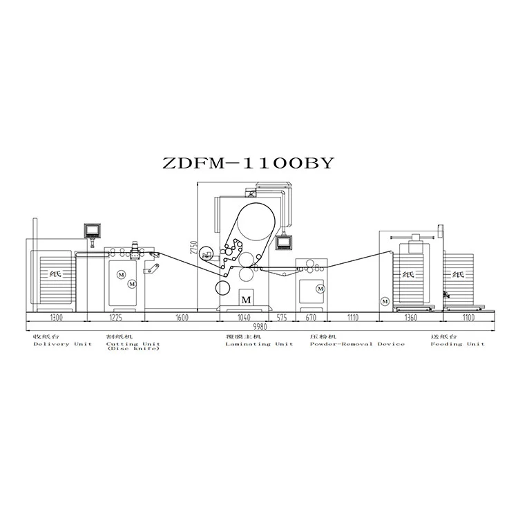 A nyomtatott anyagot a papír szállítószalag a meghatározott elülső pozícióba továbbítja, majd betáplálja. A fóliát az adagolóberendezés betáplálja, ragasztóval bevonja és megszárítja. A papírt és a fóliát az elektromágneses fűtőhenger és a gumi nyomóhenger nyomás alá helyezik, majd laminálják. Vágja le a papír átfedő részét egy késtárcsával vagy csiszolópapírkoronggal, és válassza le a papírt a papírhúzó hengerrel. Ezután a szétválasztott késztermékeket egy automatikus papírfogadó és kötegelő rendszerbe küldik egy szállítószalagon az egyes késztermékek összegyűjtésére.
